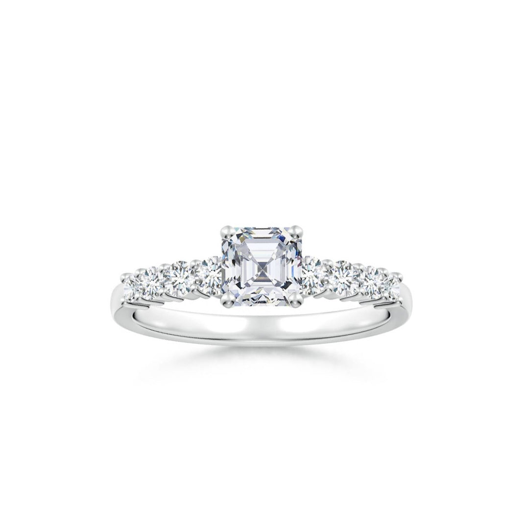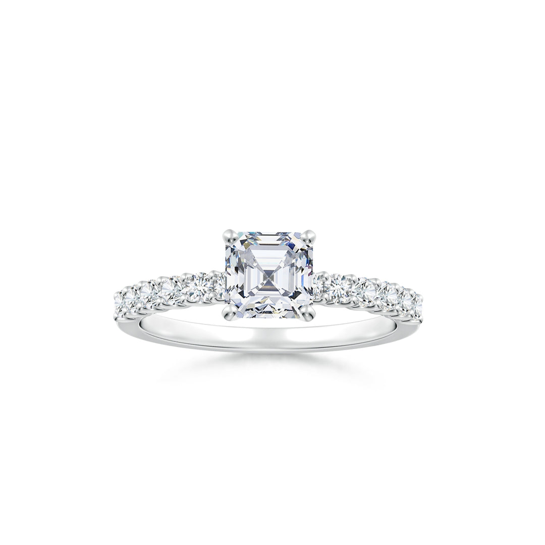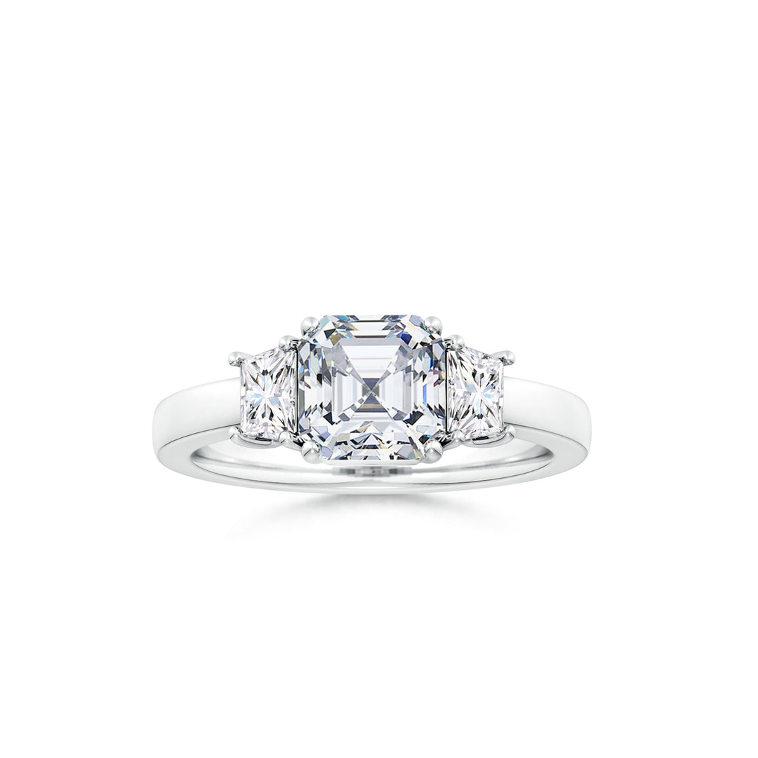 Discover classic Asscher solitaires, pavé-band Asschers, cathedral shoulders, halos and hidden halos (square or octagonal), plus three-stone designs with tapered baguettes or trapezoids. Choose natural or lab-grown diamonds and your metal—18K yellow, white, rose gold or platinum.