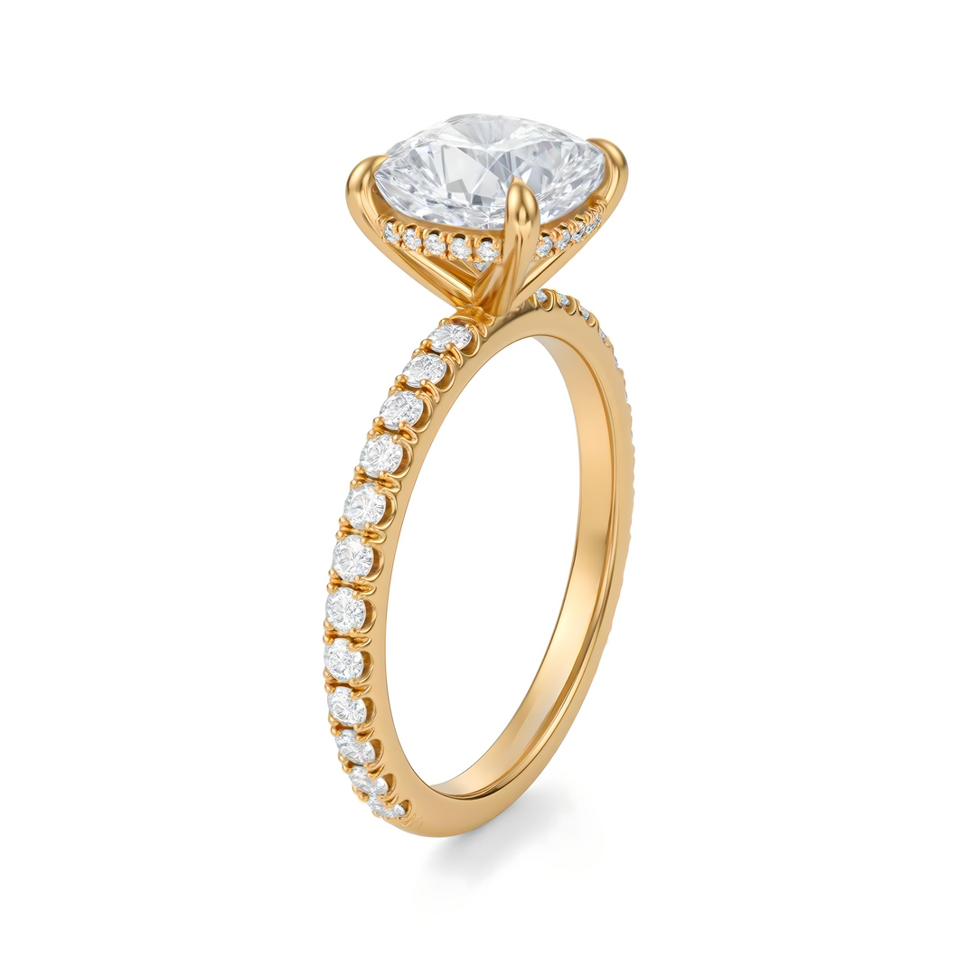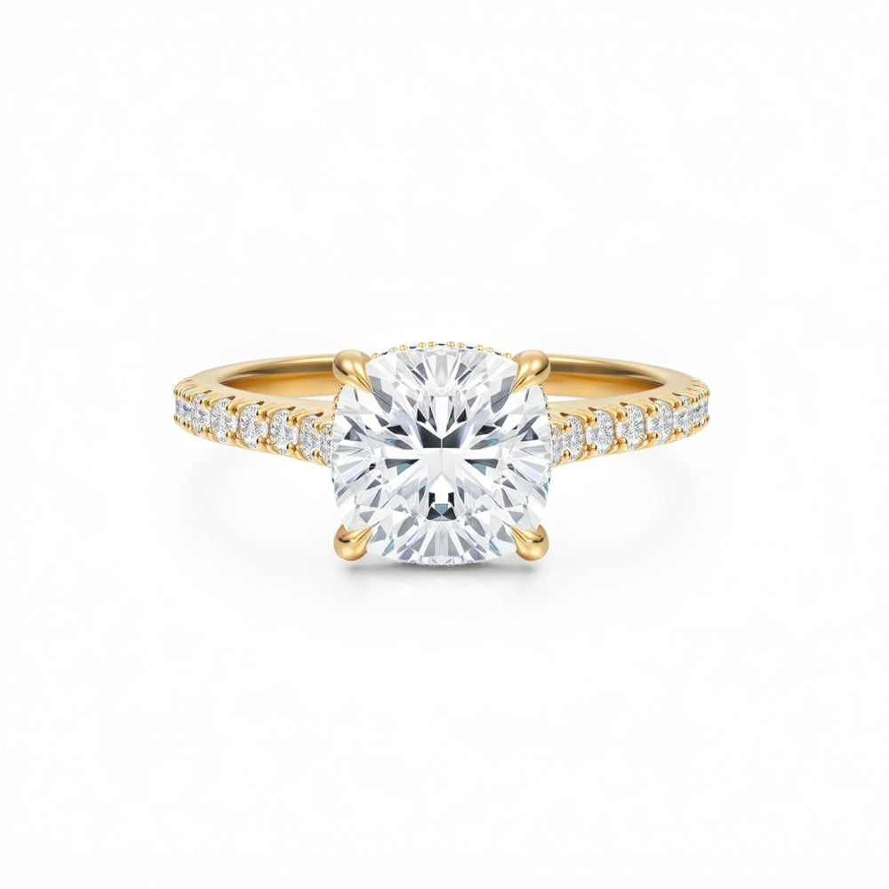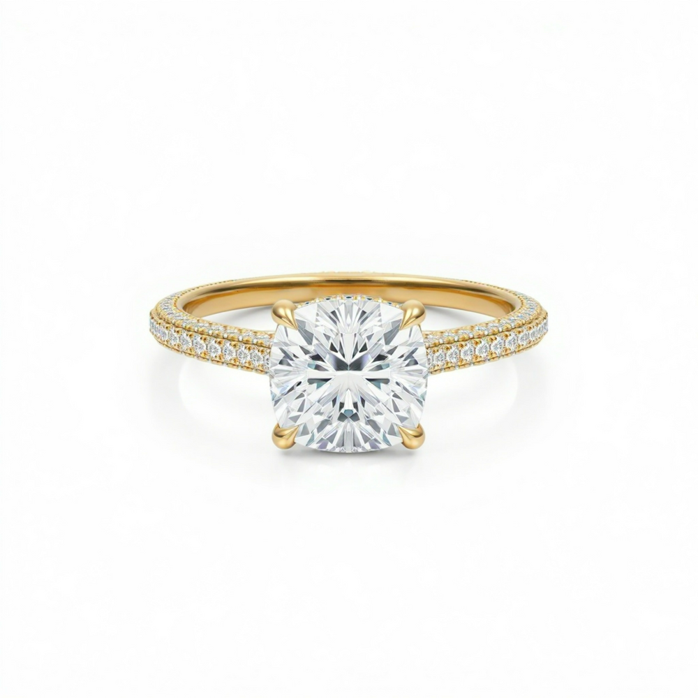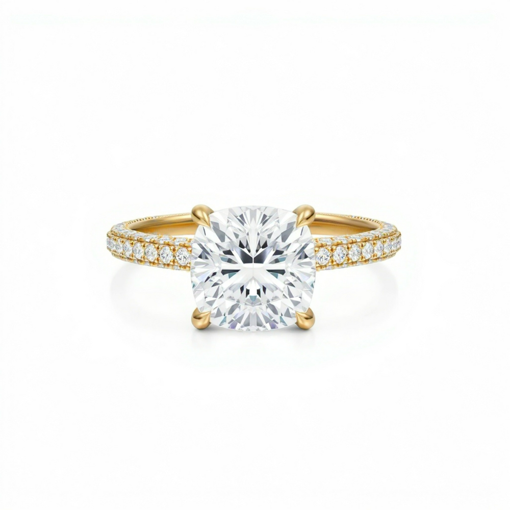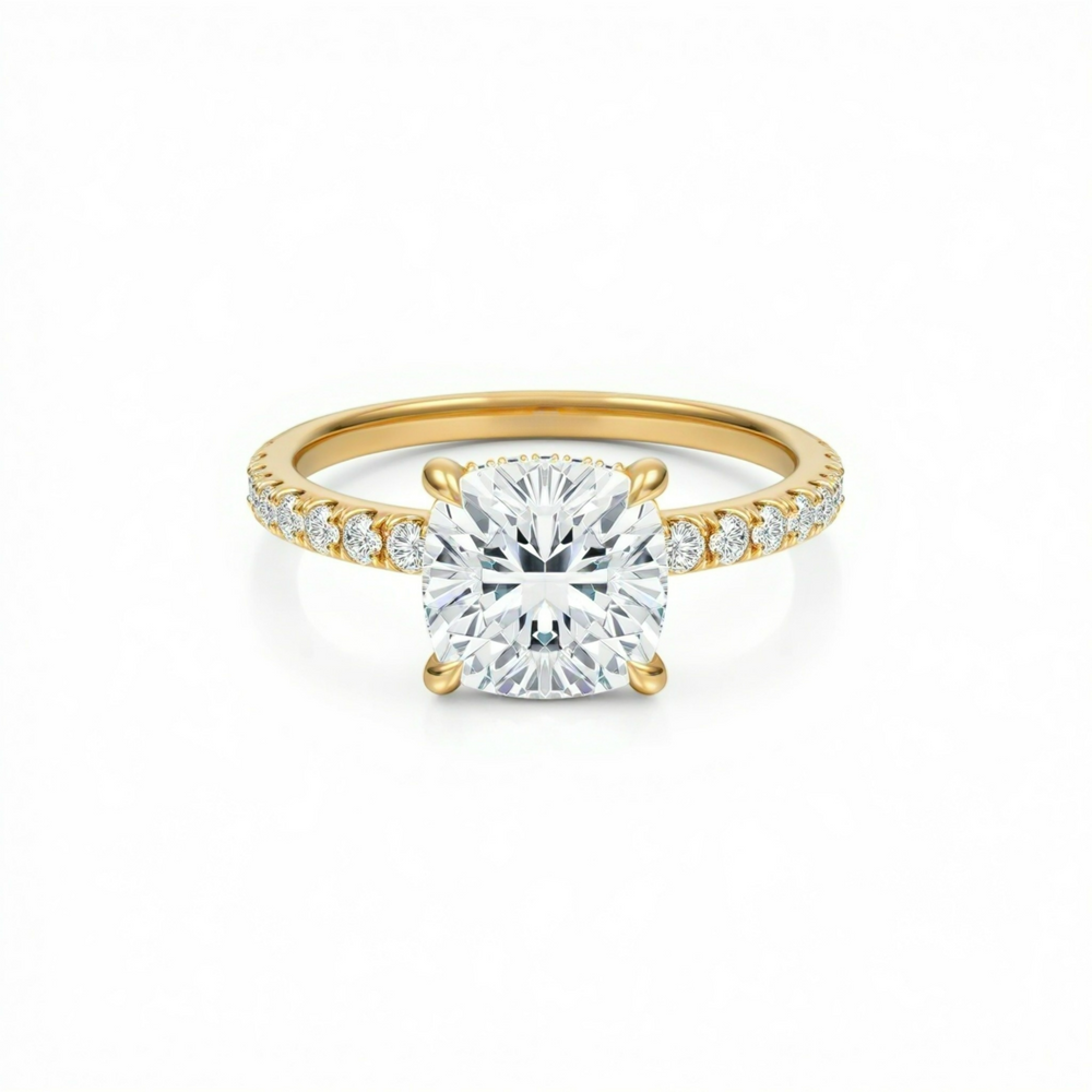 Discover classic cushion solitaires, pavé-band cushions, cathedral shoulders, halos and hidden halos, plus three-stone designs (cushion with half-moons or trapezoids). Choose natural or lab-grown diamonds, your metal (18K yellow, white, rose gold or platinum), and the look you love—modern brilliant or antique-style facets.
