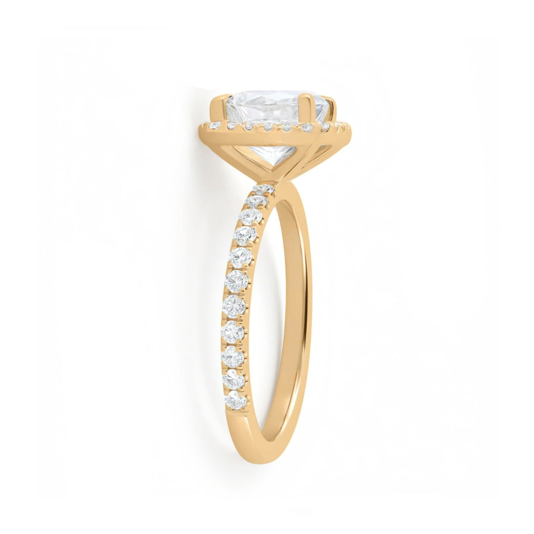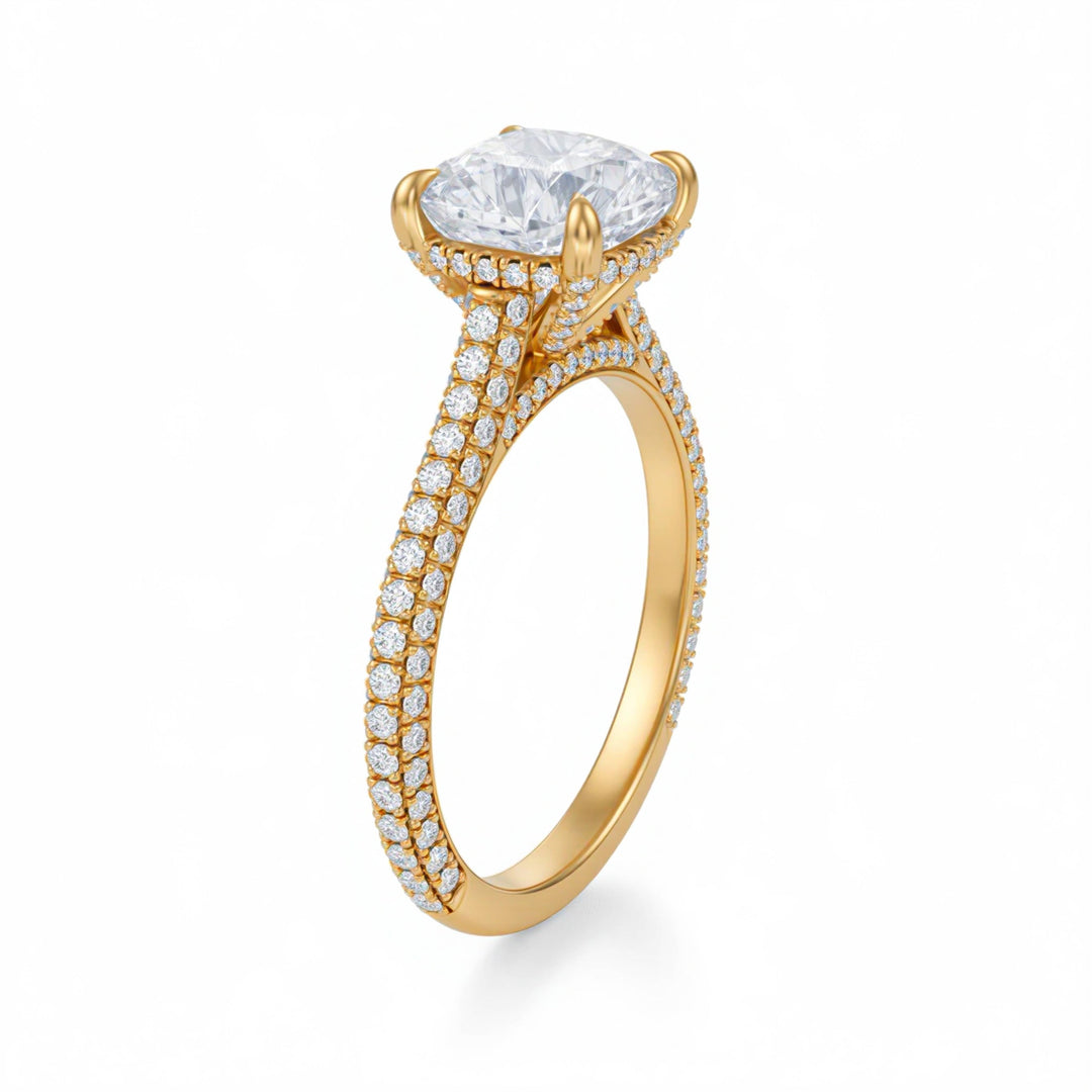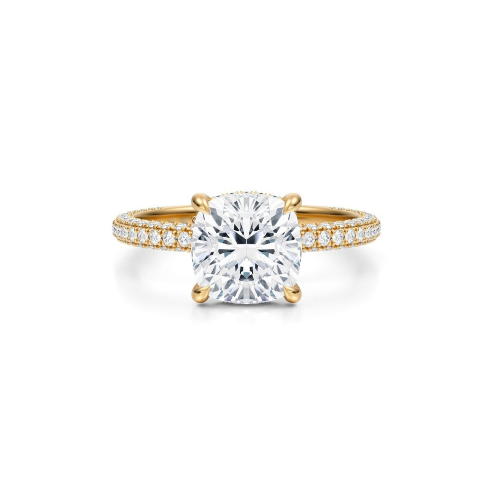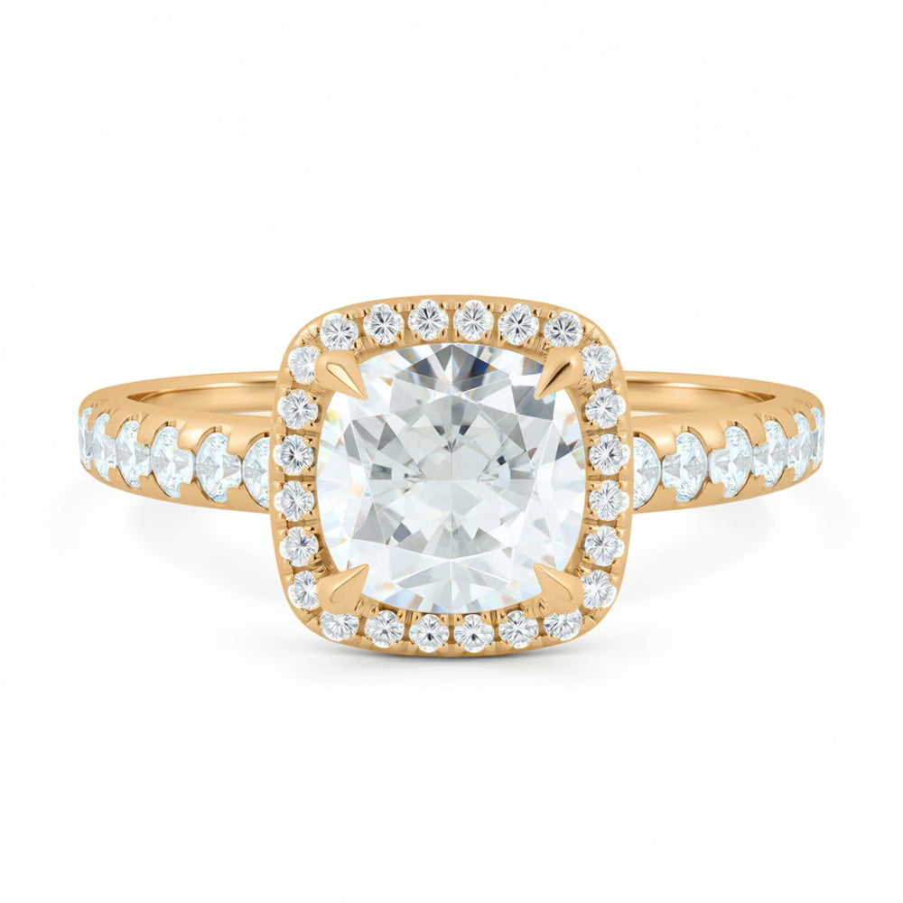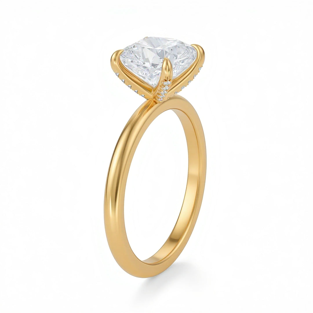 Discover classic cushion solitaires, pavé-band cushions, cathedral shoulders, halos and hidden halos, plus three-stone designs (cushion with half-moons or trapezoids). Choose natural or lab-grown diamonds, your metal (18K yellow, white, rose gold or platinum), and the look you love—modern brilliant or antique-style facets.