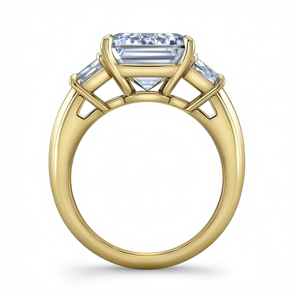 Four double claws or a bezel for corner protection; cathedral shoulders for lift; halos/hidden halos for added presence; tapered baguette sides for a classic trilogy.