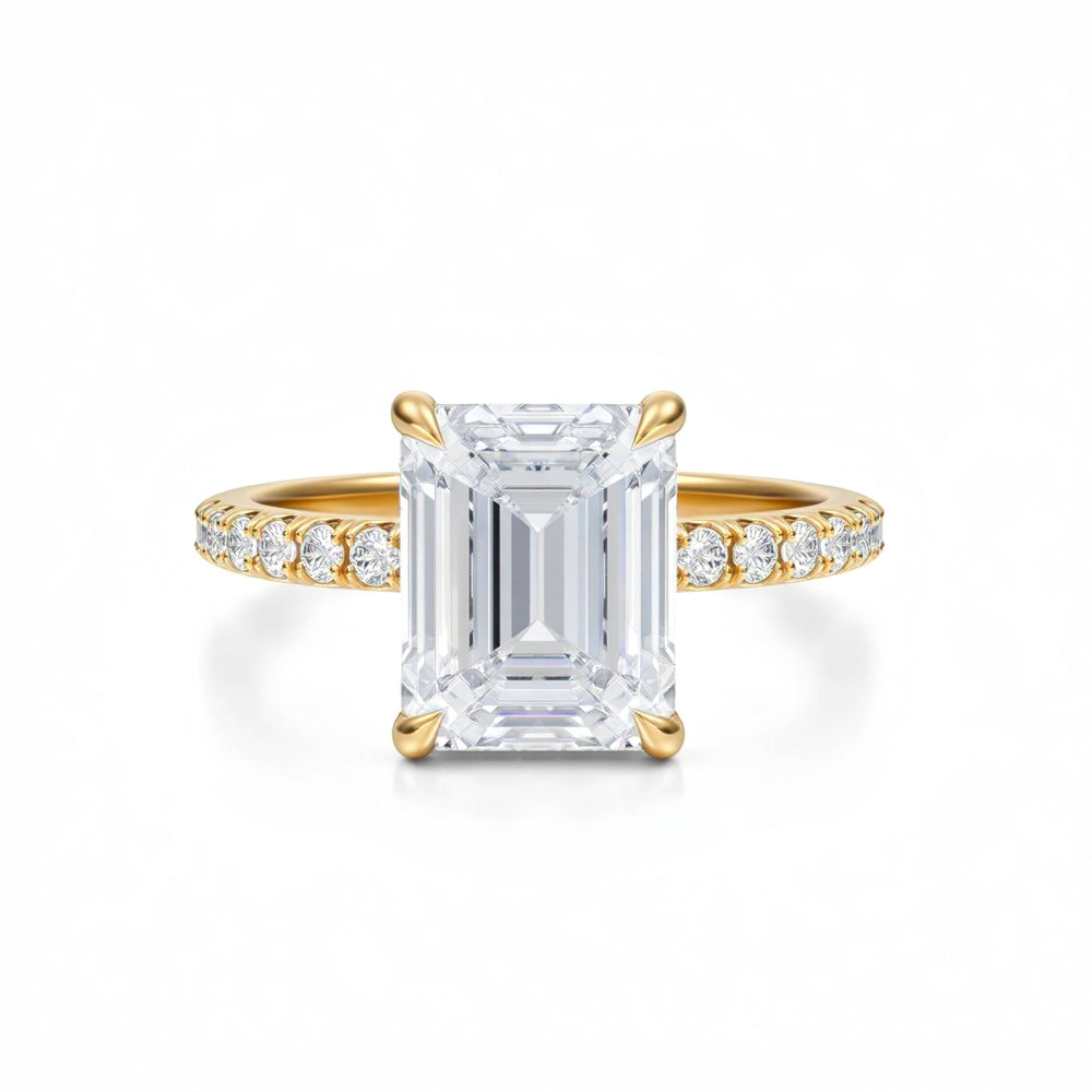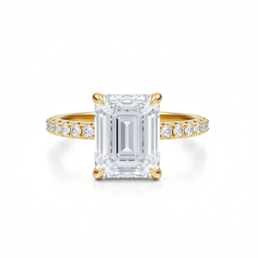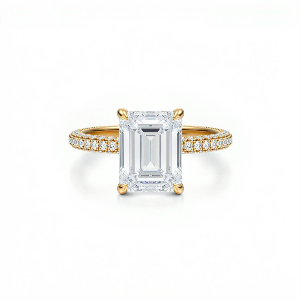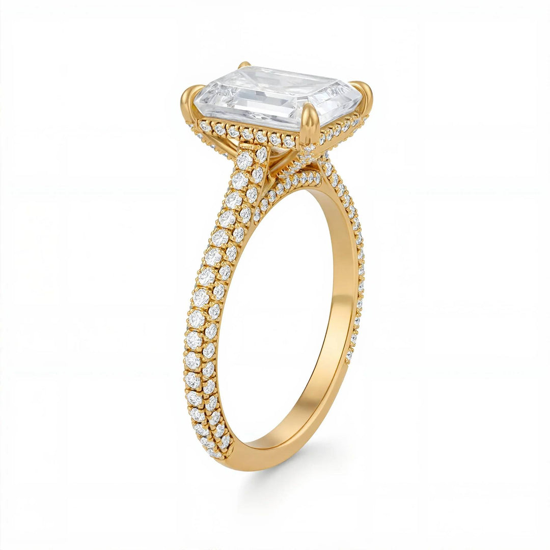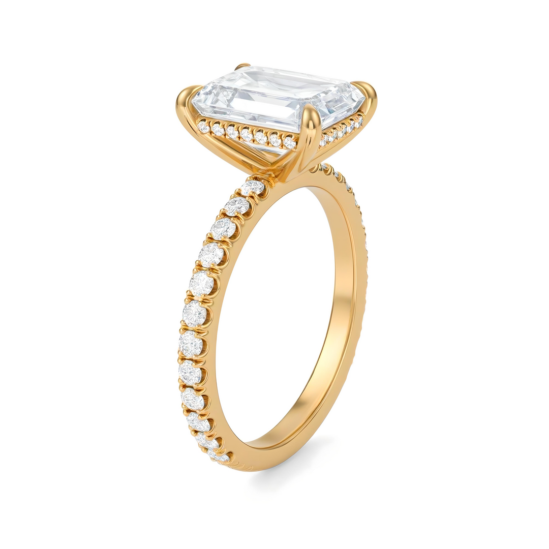 Discover classic emerald solitaires, pavé-band emeralds, cathedral shoulders, halos and hidden halos, plus three-stone designs (emerald with tapered baguettes, trapezoids, or bullets). Choose natural or lab-grown diamonds and your metal—18K yellow, white, rose gold or platinum.