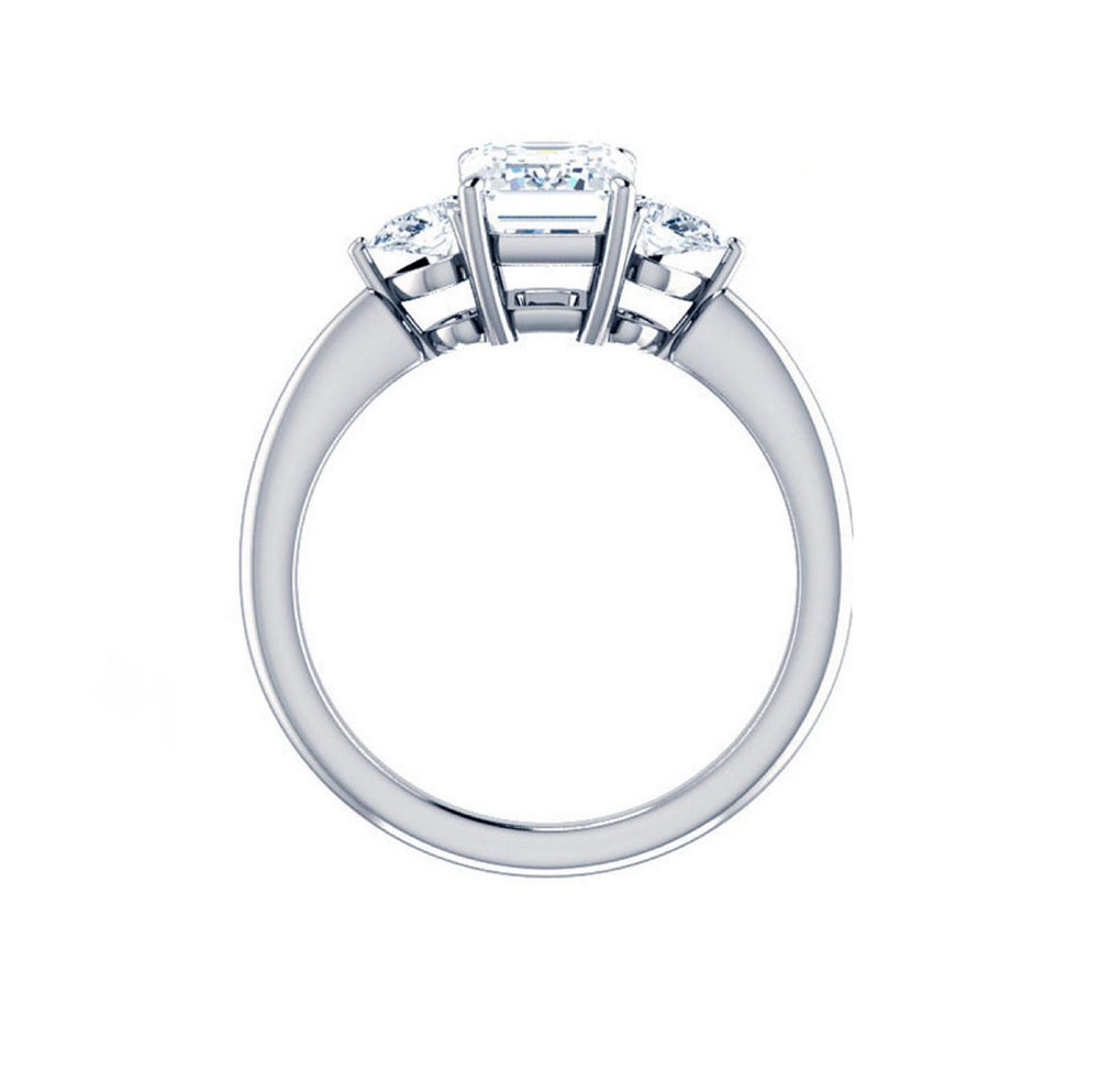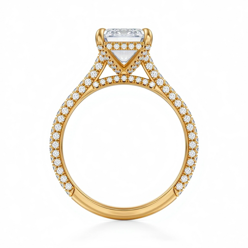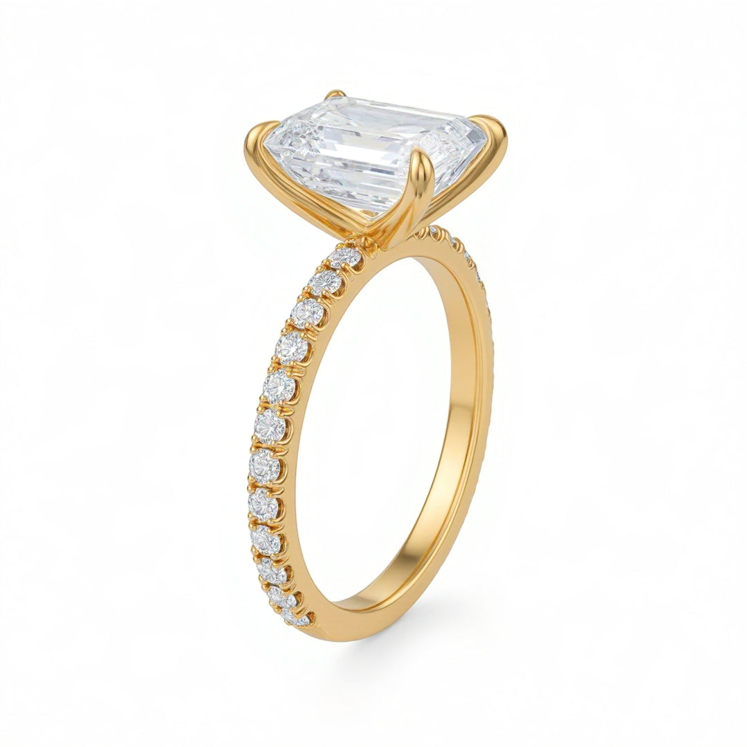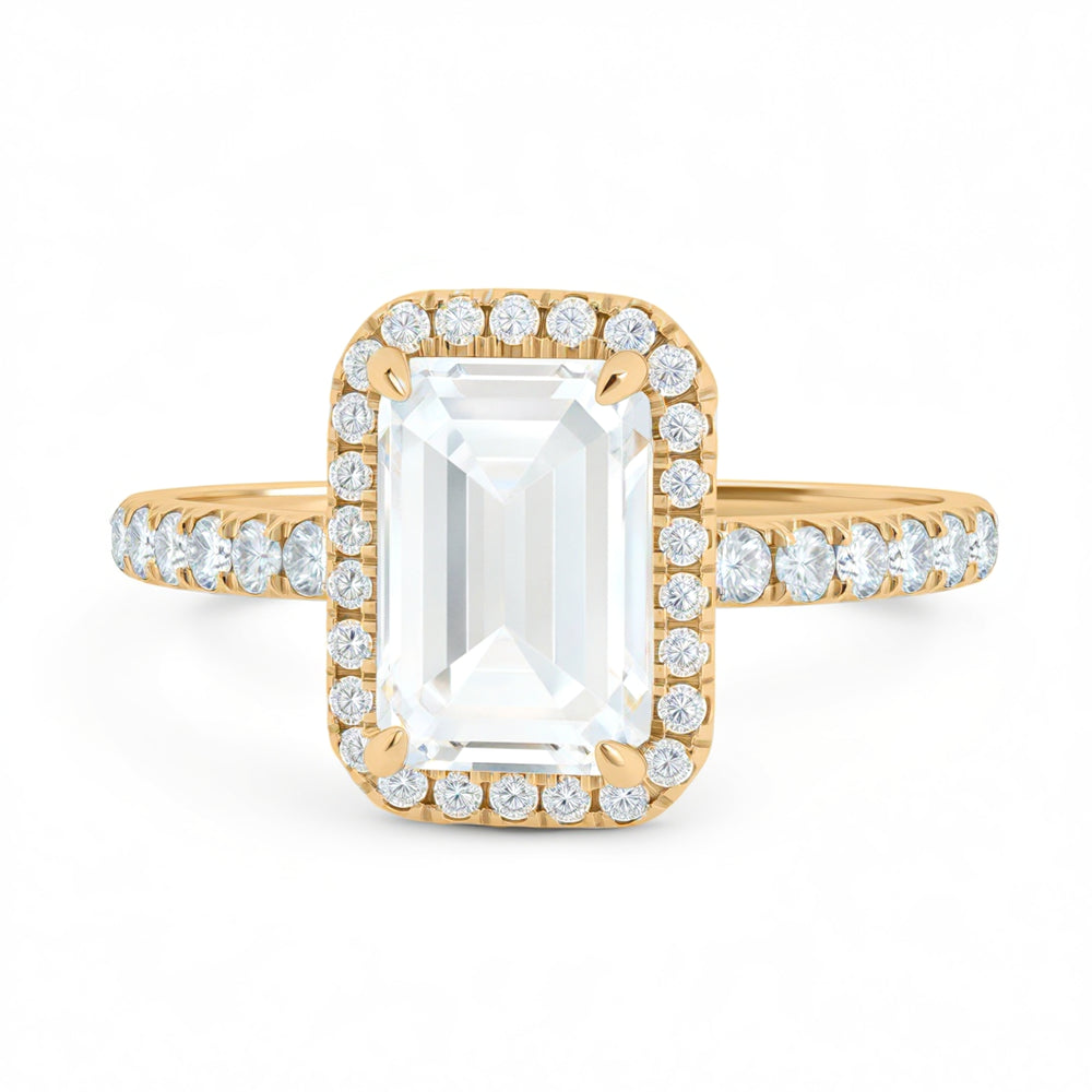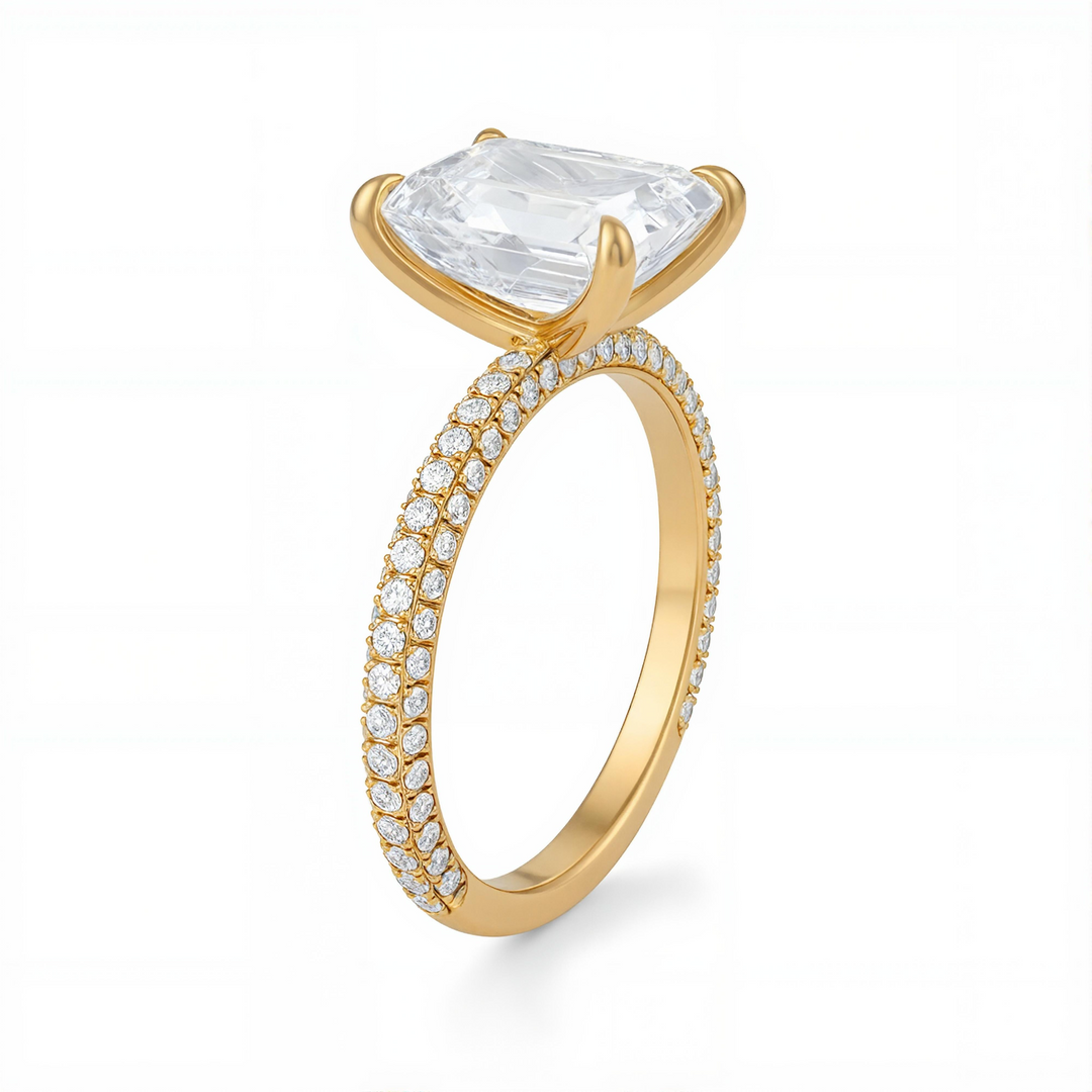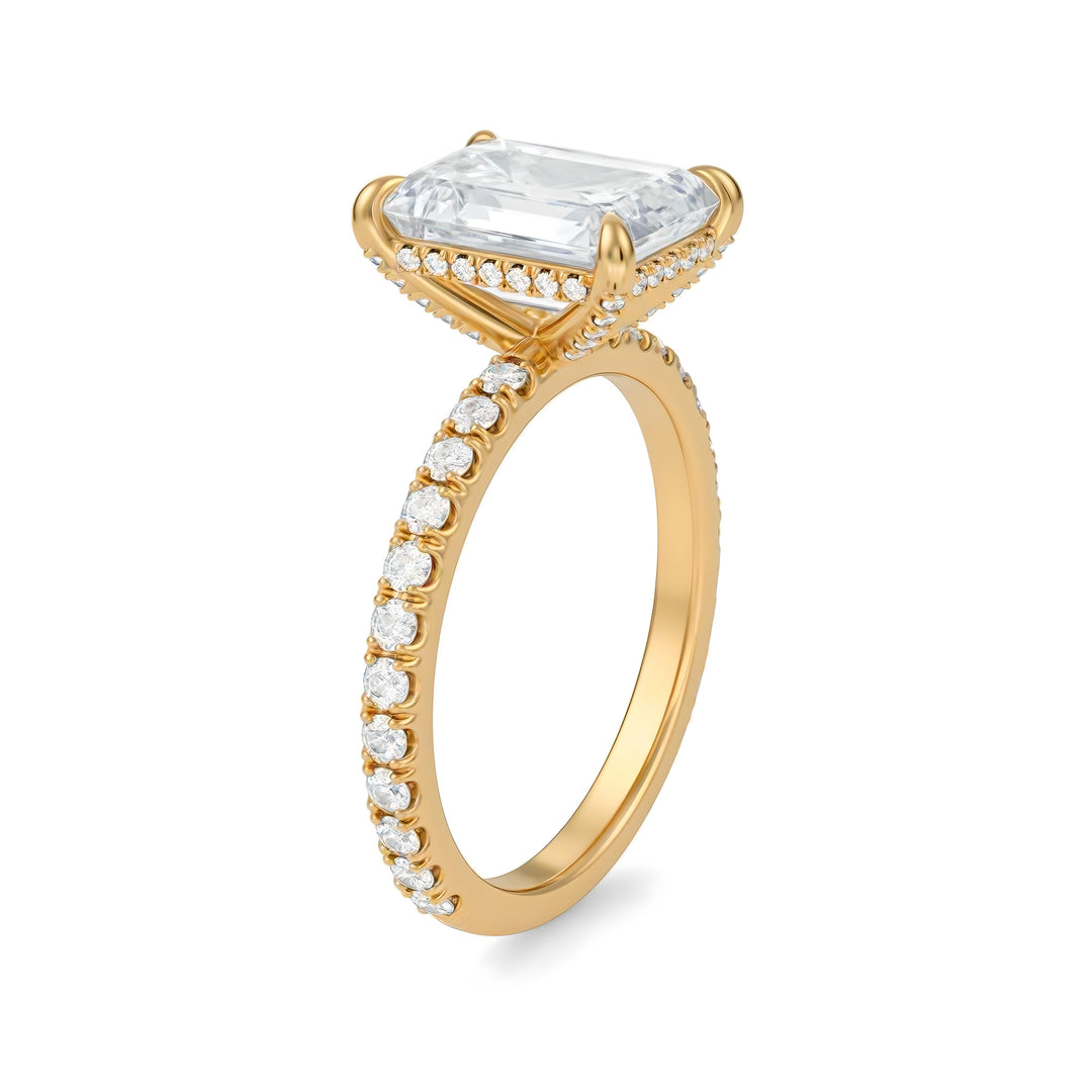 Discover classic emerald solitaires, pavé-band emeralds, cathedral shoulders, halos and hidden halos, plus three-stone designs (emerald with tapered baguettes, trapezoids, or bullets). Choose natural or lab-grown diamonds and your metal—18K yellow, white, rose gold or platinum.
