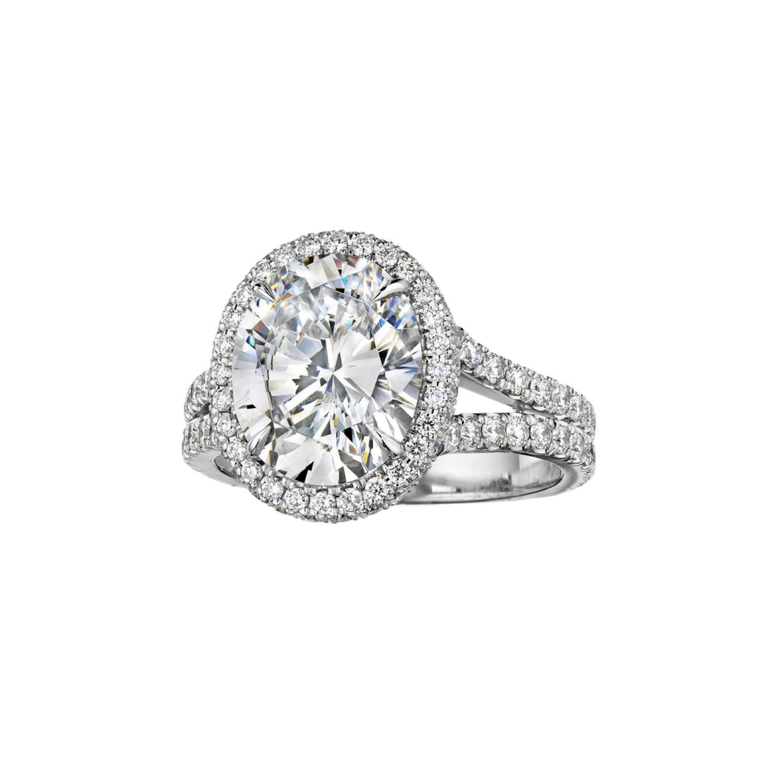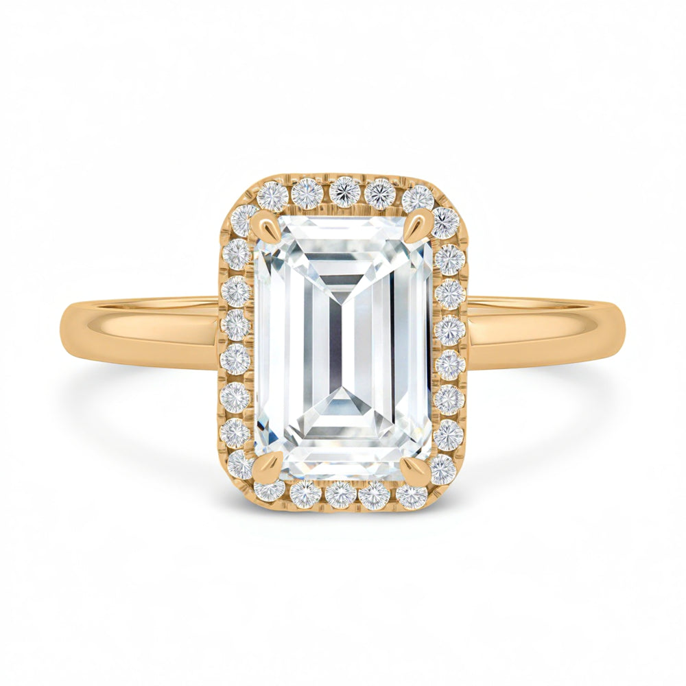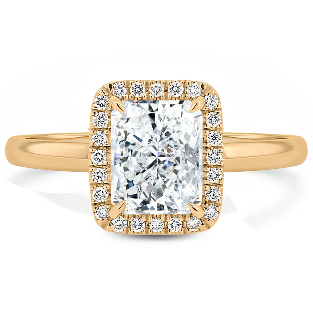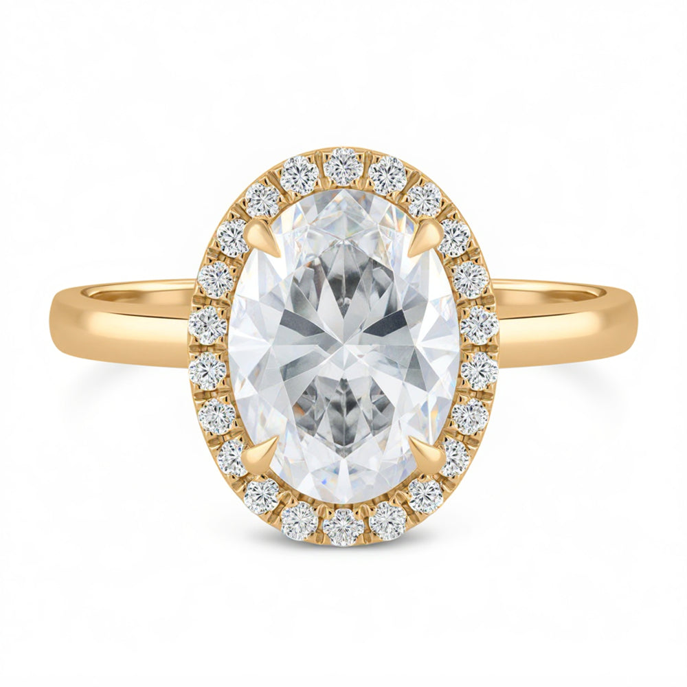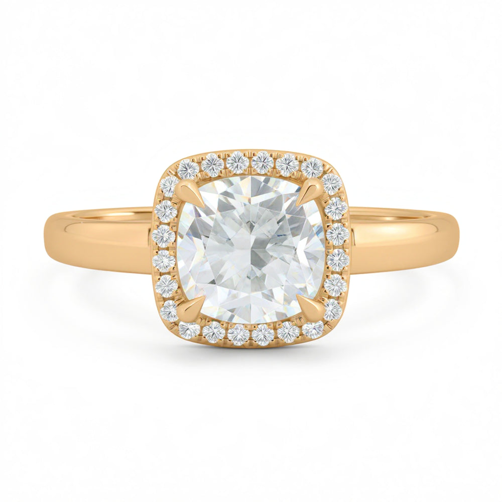 A halo surrounds the centre diamond with pavé-set melee, boosting sparkle and visual size. The design softens edges, enhances fire, and flatters every diamond shape—from round and oval to cushion, pear, emerald and radiant.