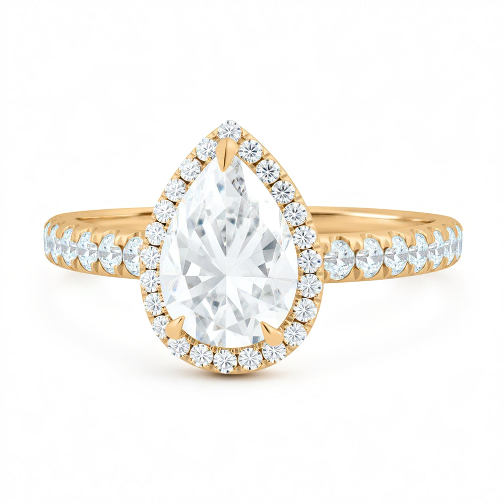 A luminous halo frames the pear-cut lab-grown diamond, intensifying its sparkle and giving the centre stone a bold, modern presence. The plain, high-polish band keeps the silhouette clean and timeless, drawing all attention to the halo and centre stone.