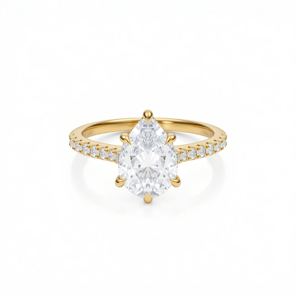 A gold ring featuring a pear-shaped lab-grown diamond center stone with a pave setting along the band.