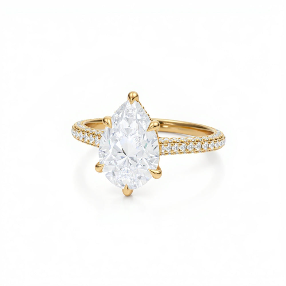 Trio pave runs scintillating from the band to the pave encrusted lines of a cathedral setting, holding aloft an elegant pear-shaped, lab-grown diamond.